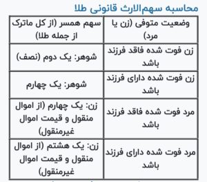 تقسیم ارث طلا در جمهوری اسلامی ایران، کاملاً تابع قانون مدنی است و هیچ استثنایی برای نوع طلا (زینتی بودن یا نبودن) وجود ندارد. برای اطمینان از صحت تقسیم، ابتدا سهم همسر متوفی (ورثه سببی) و سپس سهم ورثه نسبی بر اساس طبقات و درجات ارث محاسبه می‌گردد. مهم‌ترین نکته برای وراث این است که در صورت وجود فرزند، سهم ارث طلا دختر و پسر بر اساس قاعده “پسر دو برابر دختر” محاسبه می‌شود. آگاهی از این قوانین، از بروز اختلافات و تخطی از حقوق قانونی ورثه جلوگیری خواهد کرد.