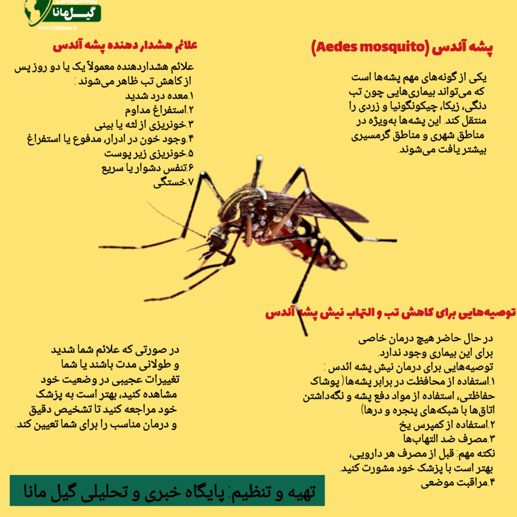 به گزارش گیل مانا، پشه آئدس یکی از گونههای مهم پشه است که میتواند بیماریهایی چون تب دنگی، زیکا، چیکونگونیا و زردی را منتقل کند، این پشه در استان گیلان نیز بدلیل شرایط آب و هوایی و محیطی مناسب مشاهده شده و لازم است که شهروندان آگاهی لازم را در حفظ سلامتی خود در مواجه با نیش این گونه از پشه داشته باشند.